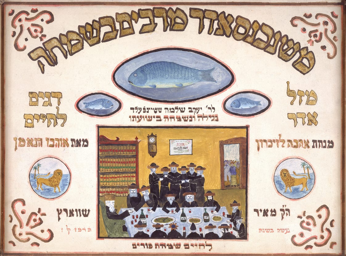 The customary Hebrew expression “When Adar arrives all should be exceedingly joyful” appears atop this wall decoration. Fish representing the Purim month of Adar, whose symbol is Pisces, are flanked by related inscriptions; a traditional celebratory meal is pictured at center. The decoration was dedicated by the artist, Meir Schwartz, to Rabbi Jacob (Julius) Solomon Steinfeld of Vienna.