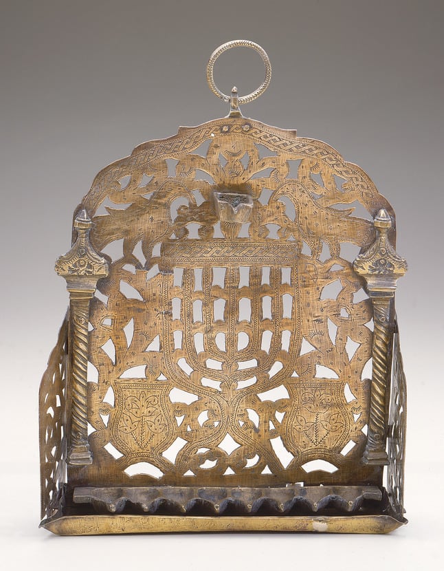 The central decorative element on this lamp is the seven-branch menorah, flanked by two vases. The majority of lamps of this type bear two Hebrew inscriptions. The first, "The seven lamps shall give light in front of the lampstand" (Numbers 8:2), describes the menorah of the Temple in Jerusalem. The second, "Blessed shalt thou be when thou comest in, and blessed shalt thou be when thou goest out" (Deuteronomy 28:6), is a reference to where the Hanukkah lamp should be placed. From ancient times, the lamp was supposed to be hung on the doorpost of one's home, to publicize the miracle that took place during the Maccabean revolt. As one entered the door, the lamp would be on the left, opposite the mezuzah. Although in later times many Jewish communities came to place the light indoors, Moroccan Jews have preserved the earlier tradition.