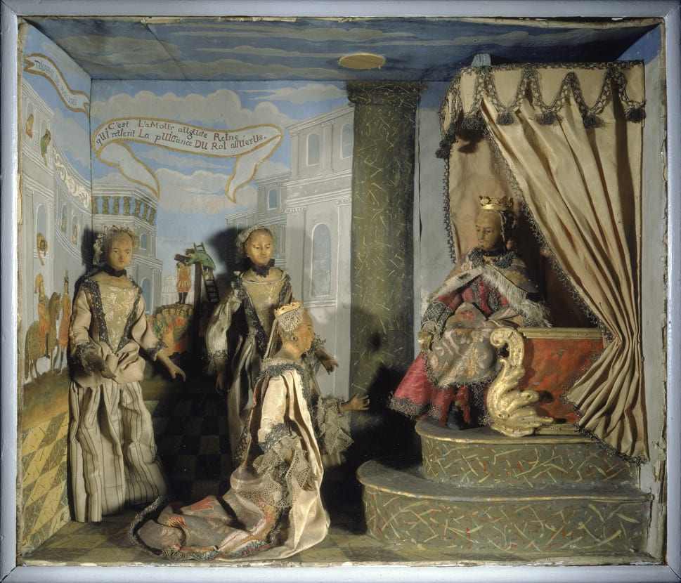 - Mixed media diorama: costumed wax figures, paper, paint, wood, and cloth